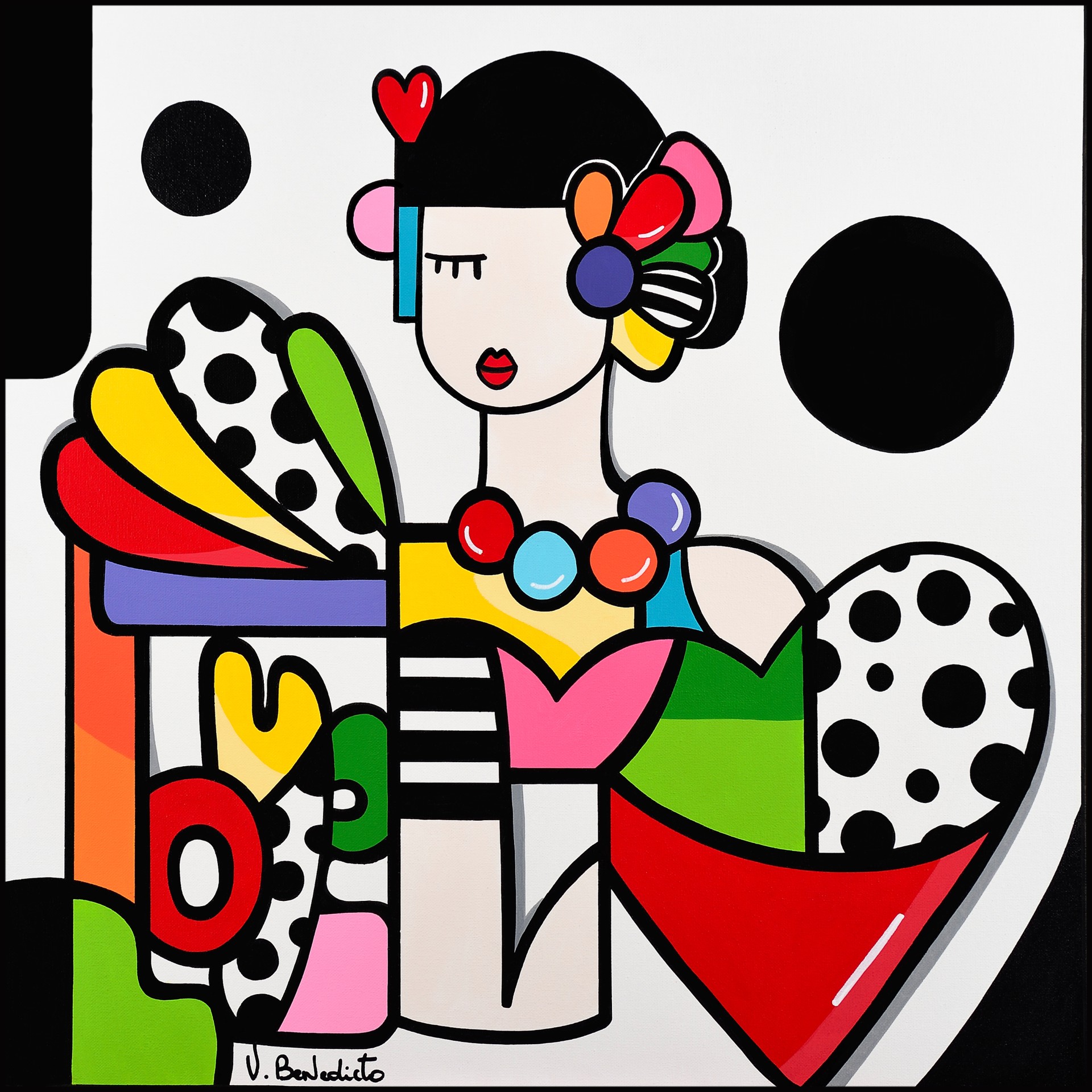Virginia explore avec passion les thèmes de l’amour et de la féminité, créant un univers à la fois joyeux et coloré tout en préservant une douceur envoûtante. Son style, en constante évolution et délibérément intemporel, intègre des éléments de pop art et de cubisme, enrichis par d’audacieuses influences latines.