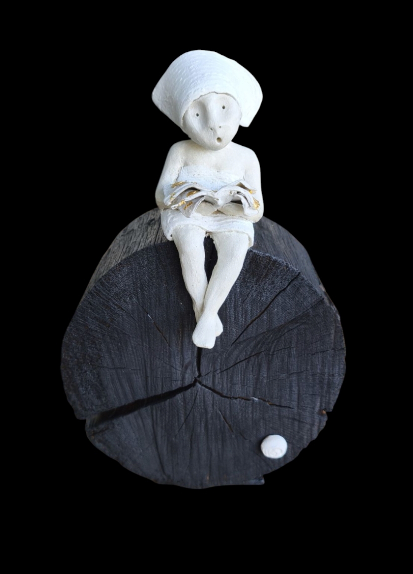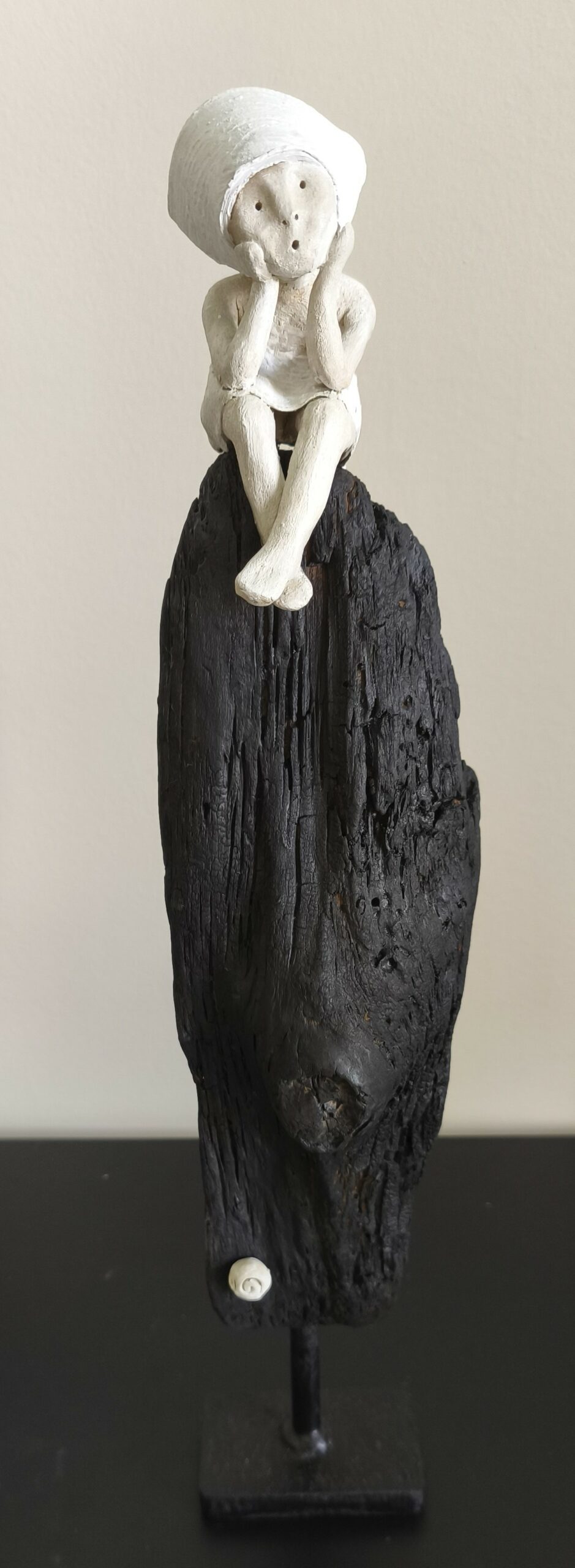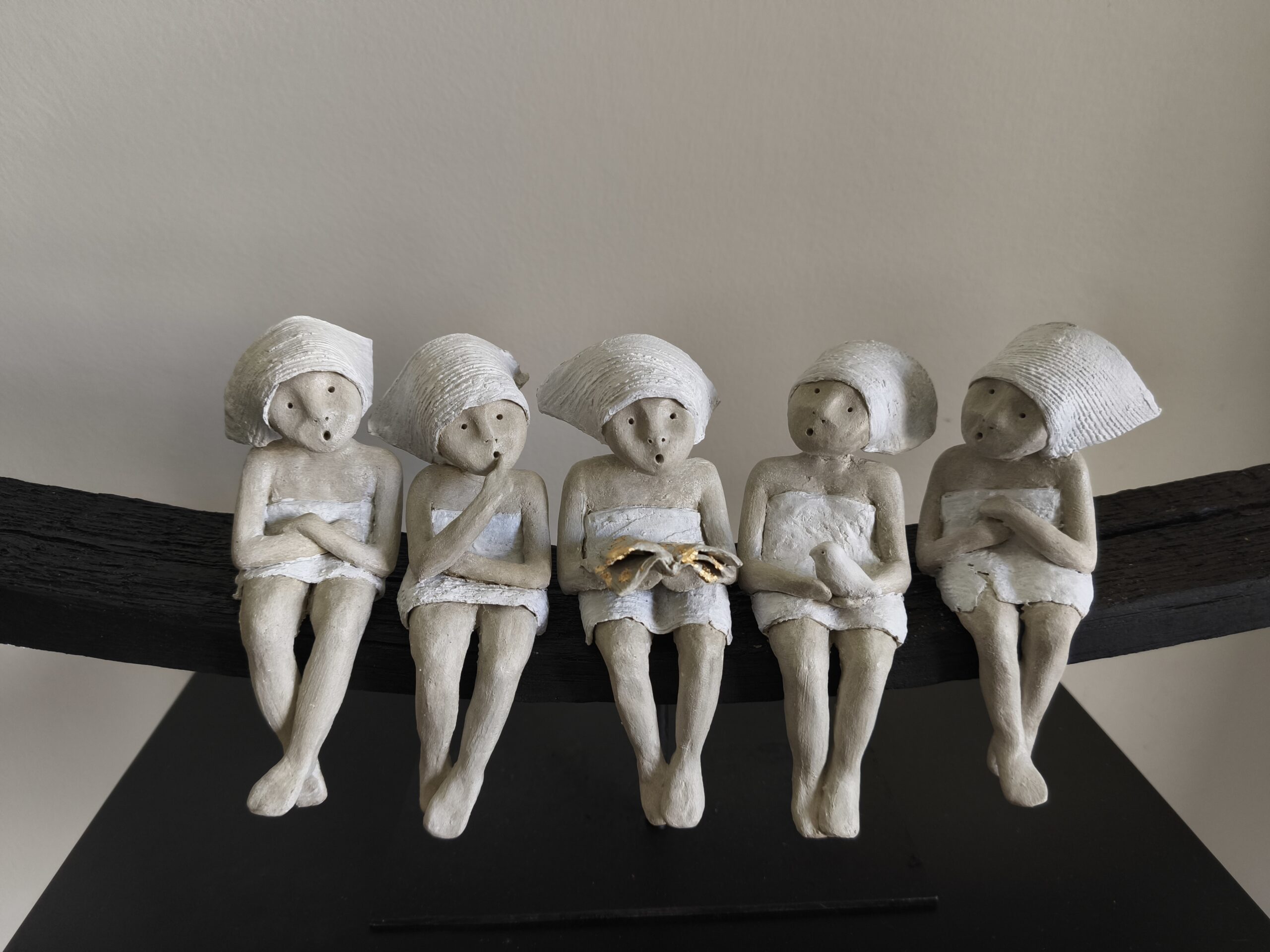 Elles sont réalisées avec une association de matériaux simples et naturels (bois, terre, cires) et une certaine sobriété dans le traitement des personnages, révélant un mariage subtil entre la matière presque brute et leur expression délicate.