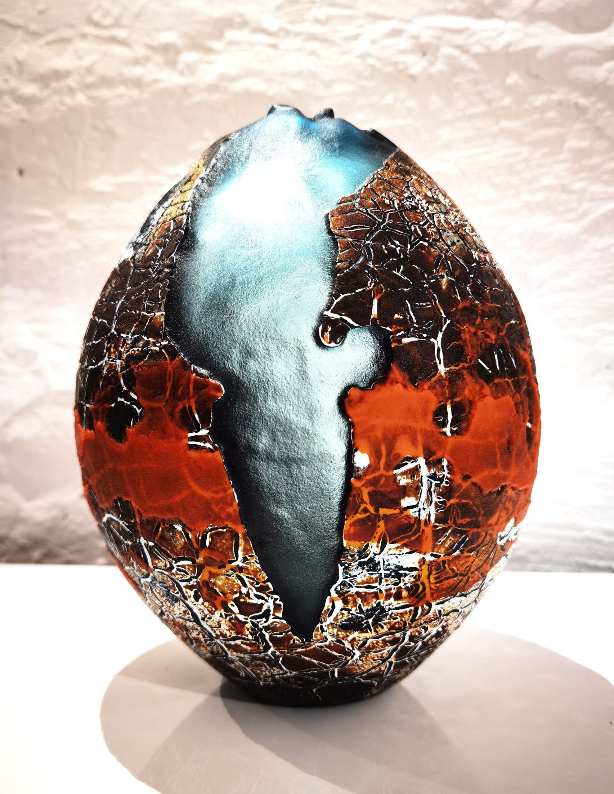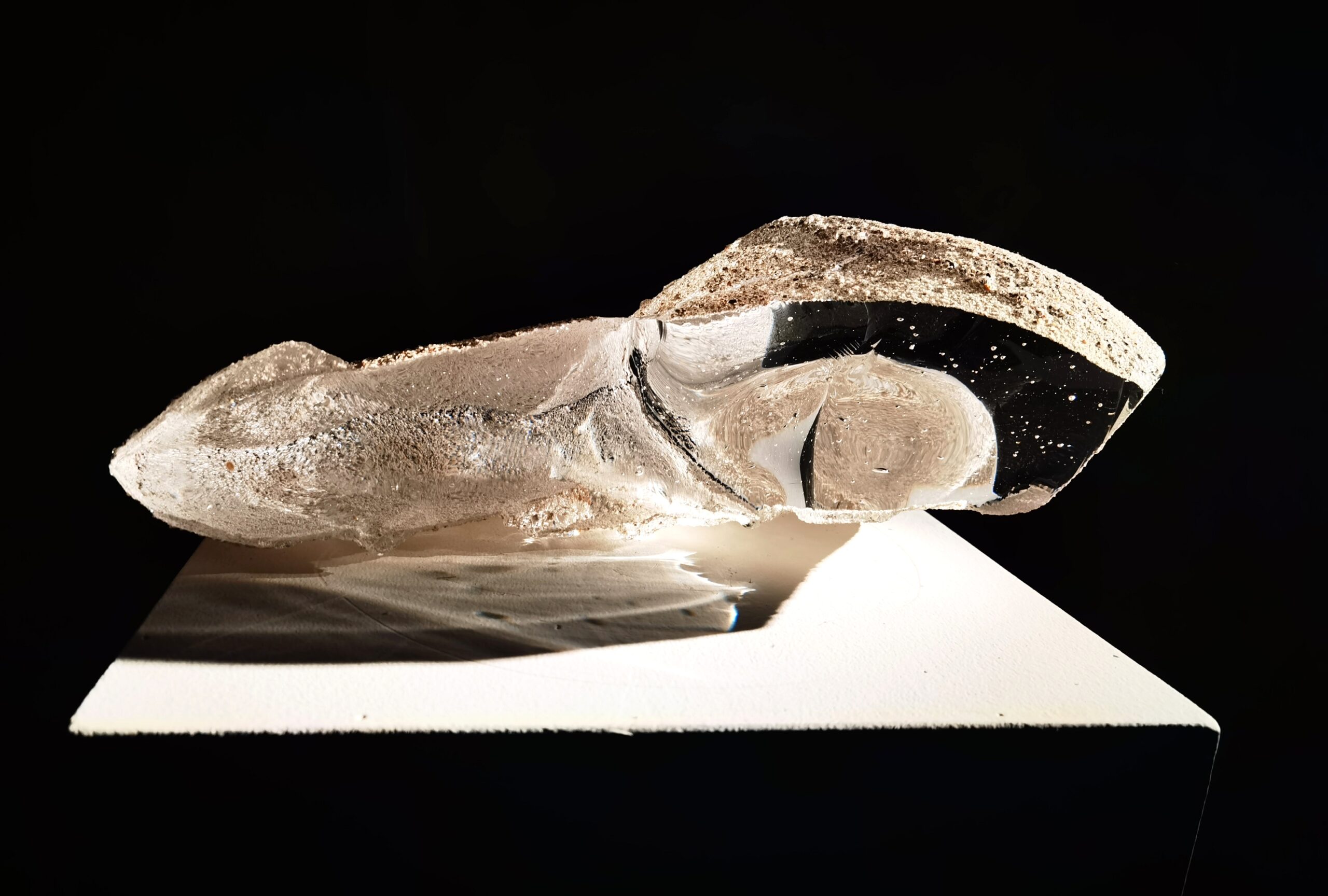 Ce médium est celui qui touche de plus près les poétiques de l’eau et du feu. La technique du verre soufflé, propice à engendrer certains métamorphismes, nourrit par surcroît les songes qui parcourent ce voyage entre magma, souffle, eau et terre.