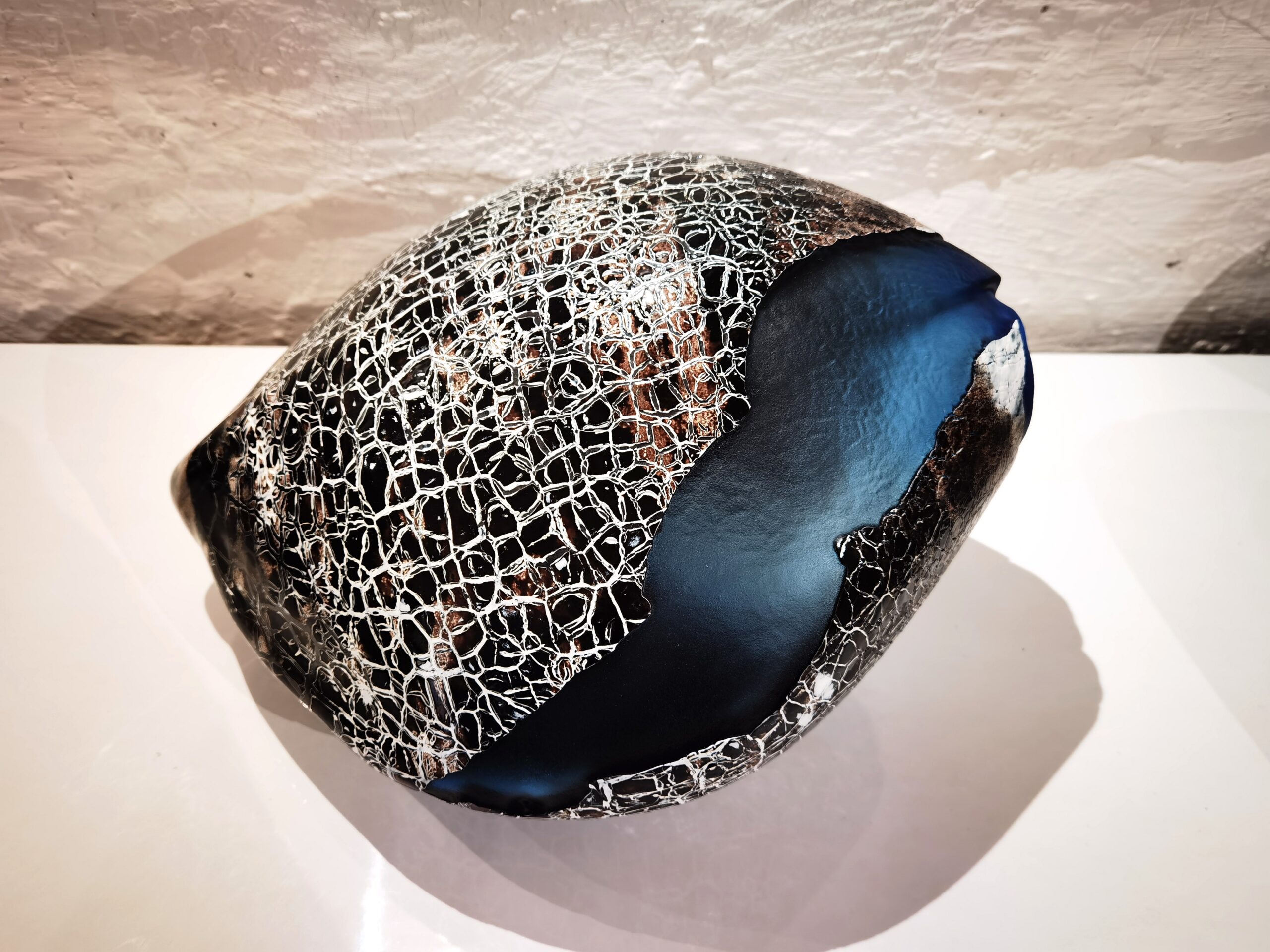 Dans ces sphères, les couleurs se heurtent ou se mélangent, les phases de travail se superposent, les textures s’entrechoquent. Le mat du verre torturé à la sableuse cède à la brillance de la matière polie. Le contraste dur révèle une douce harmonie.